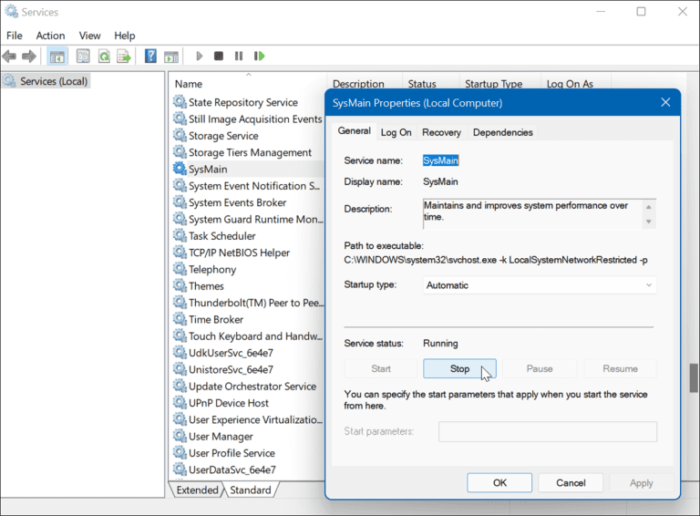 3 – When the Services console appears, double-click SysMain and then click the Stop button.