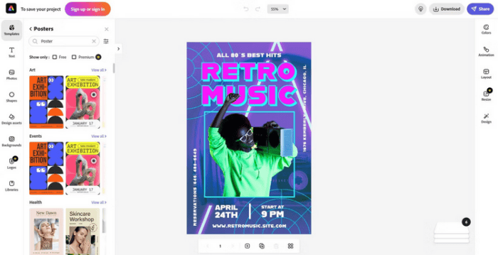 The free poster maker from Adobe Express is coming next. Adobe Express, like Canva, is an online graphic design tool with many distinct features. To get started with Adobe Express, choose an existing template. Adobe Express features over 5,000 distinct poster templates, so you’ll likely find one that meets your demands. Of course, if you want something unique, you may always browse the many options for backdrops, images, shapes, and more to design something from scratch.
