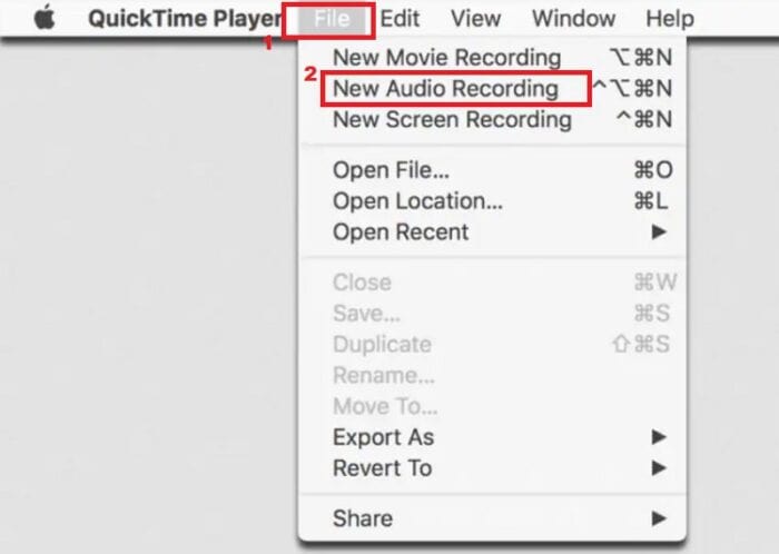 - First, open YouTube and search for the music you wish to record. Next, open QuickTime Player and select the “New Audio Recording” option from the “File” menu and submenus.