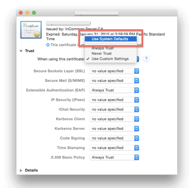 Following the “Trust” section, set “When using this certificate” value as “Use System Defaults and then set the “Secure Sockets Layer (SSL)” value to the “No Value Specified” option.