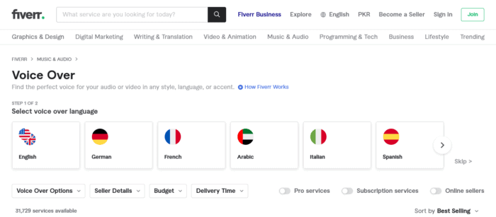 Fiverr is a popular platform for finding individuals to provide Voice Over work for your product. You may use this website to find a Voice Over artist for your company, with many options to narrow your search. Voice artists for over 50 languages are available on Fiverr, including English, German, Spanish, French, Arabic, Japanese, and Portuguese. You may choose your business goal, age, tone, gender, accent, and extra services to contact the proper individual. Also, you may sort your search results by suggesting, best-selling, or new arrivals. You may choose them based on your country of residence, seller level, budget, and delivery time. This is one of the best voice over services to try.