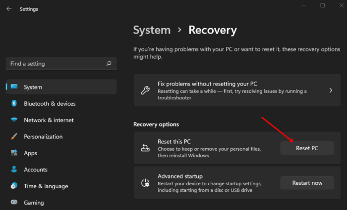3 – Click the Reset PC button here.
